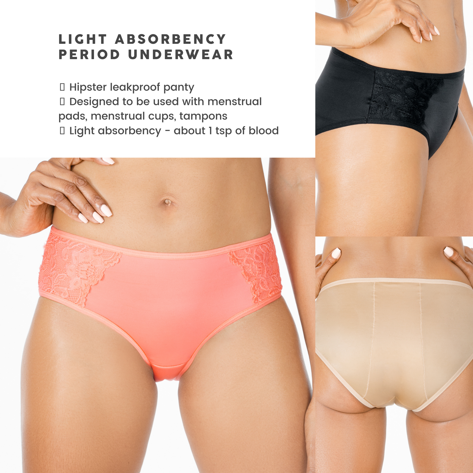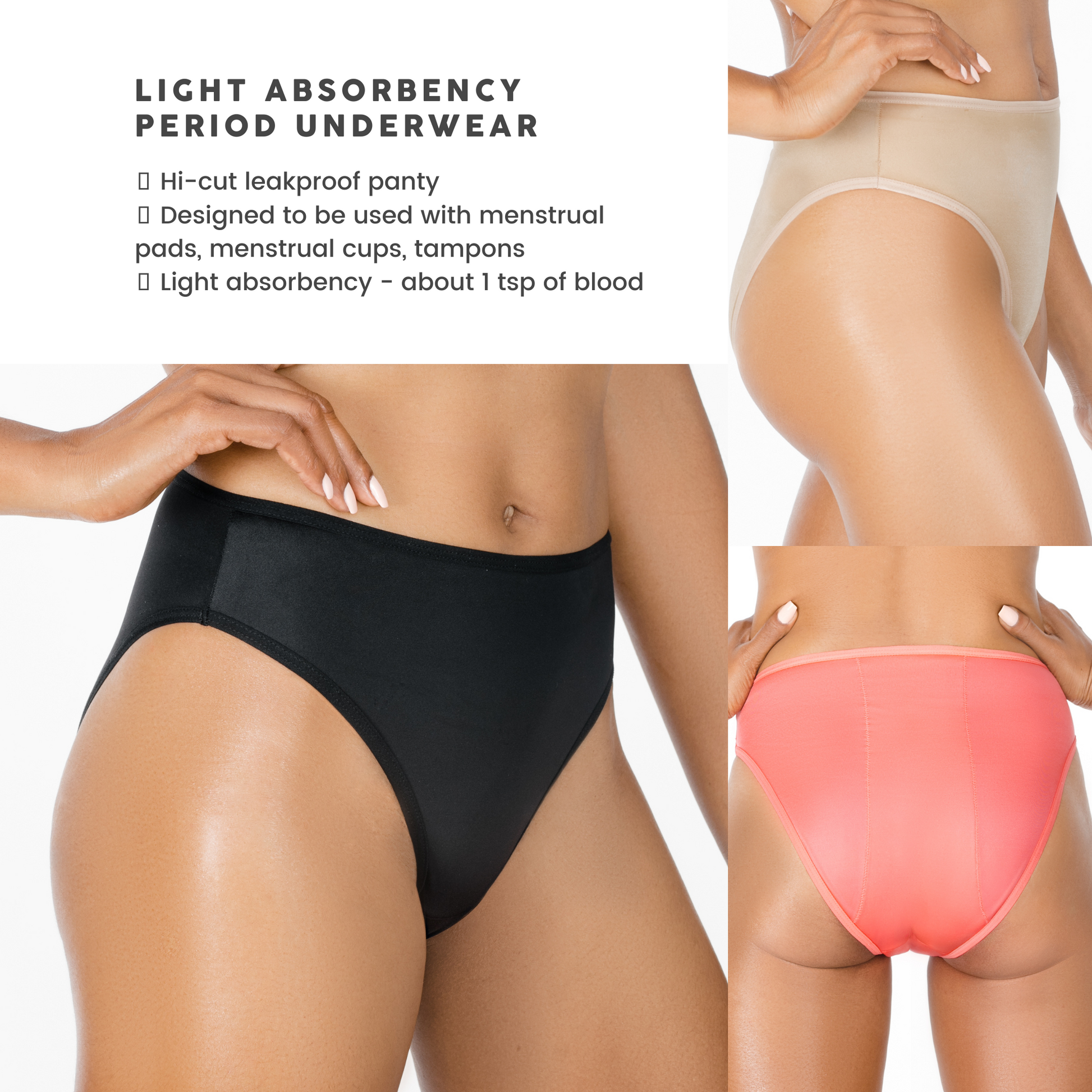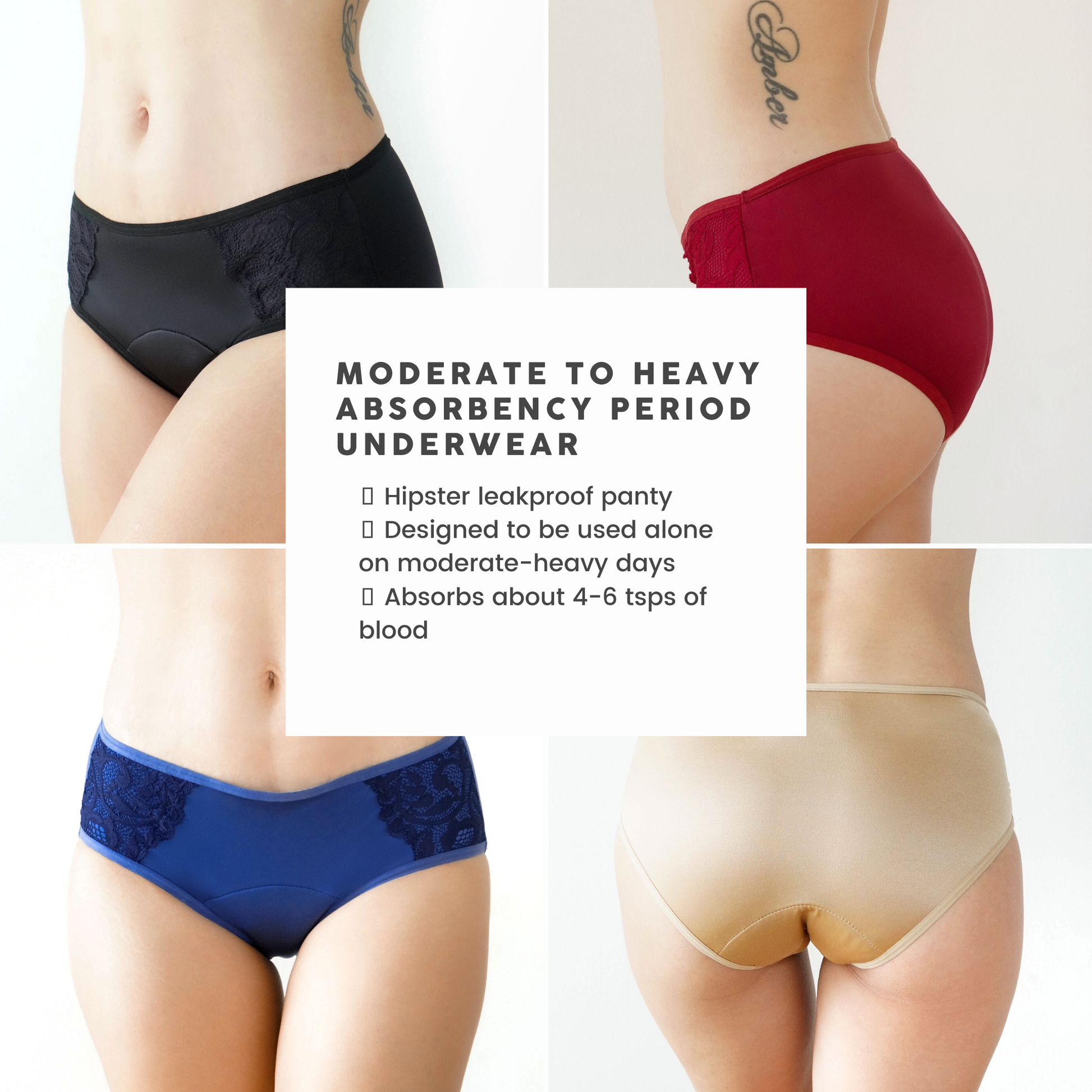 - two (2) high waist or hipster moderate absorbency panties