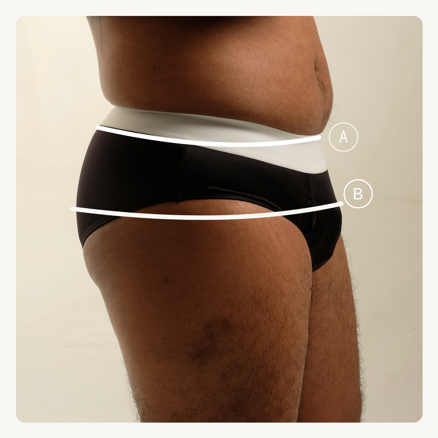 - Stand with your legs together, measure around your HIPS. Measure with your packer if you will be using the brief with a packer. (B)